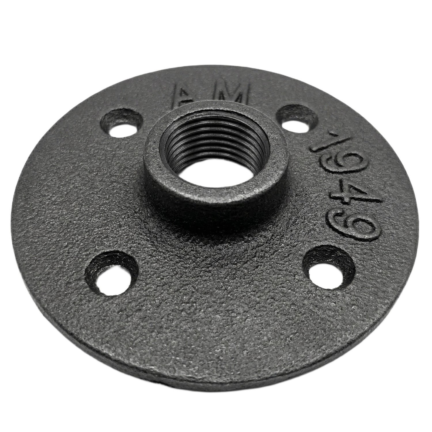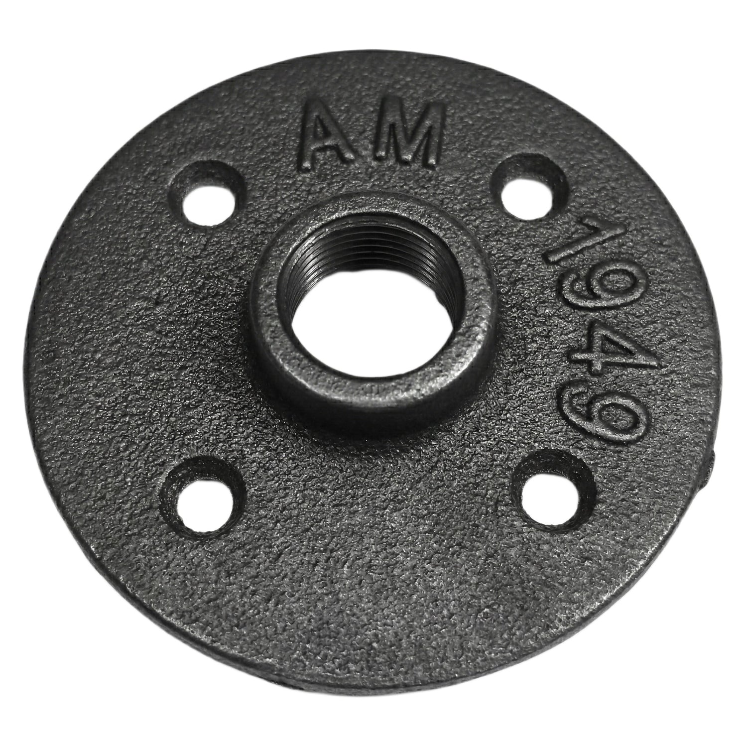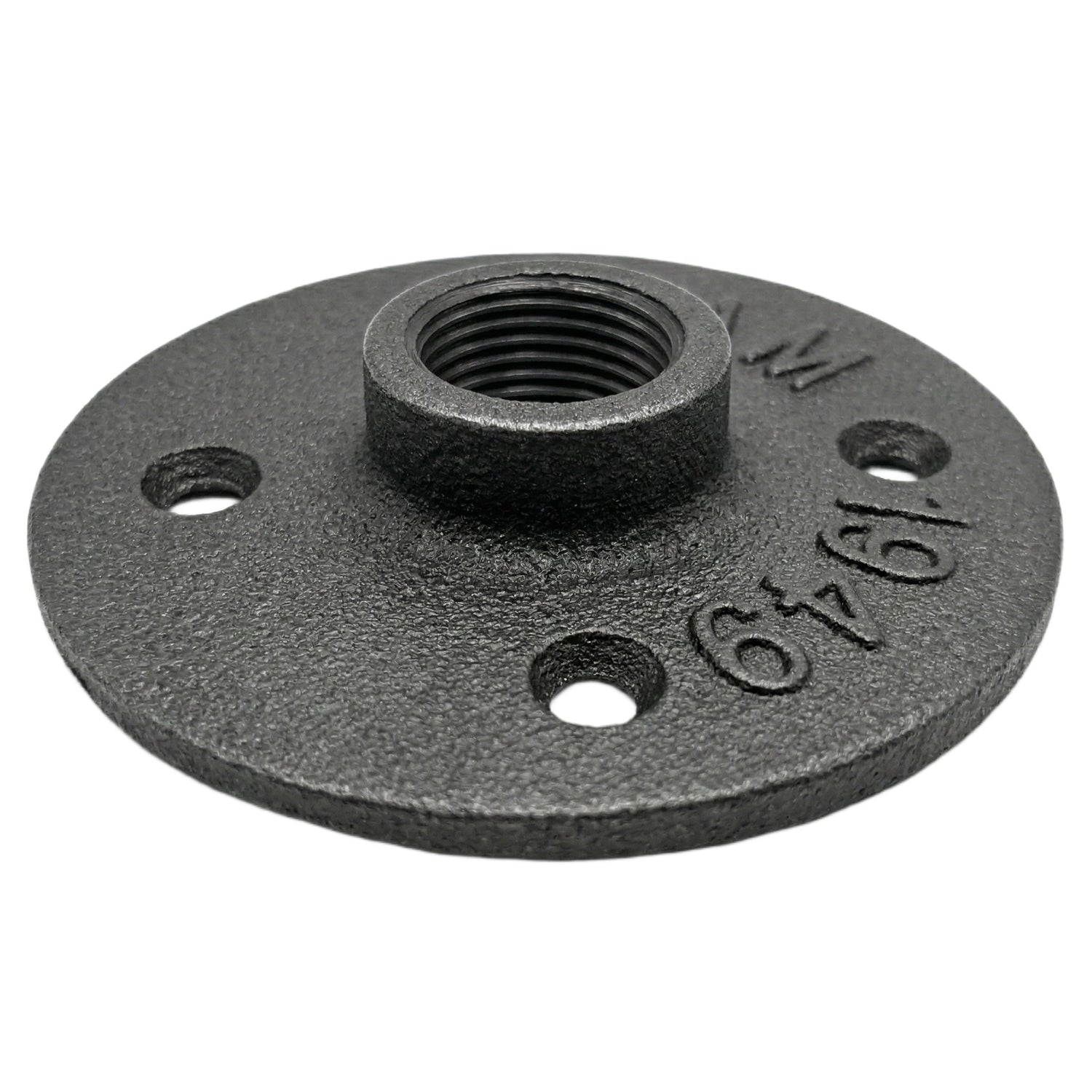 La brida de suelo es una pieza redonda, con 4 agujeros oblongos de fijación, en hierro fundido negro (color real gris). La parte central está roscada para alojar un accesorio de hierro fundido o un tubo roscado de acero negro de 21 mm de diámetro, tamaño 15x21 mm = 1/2''.