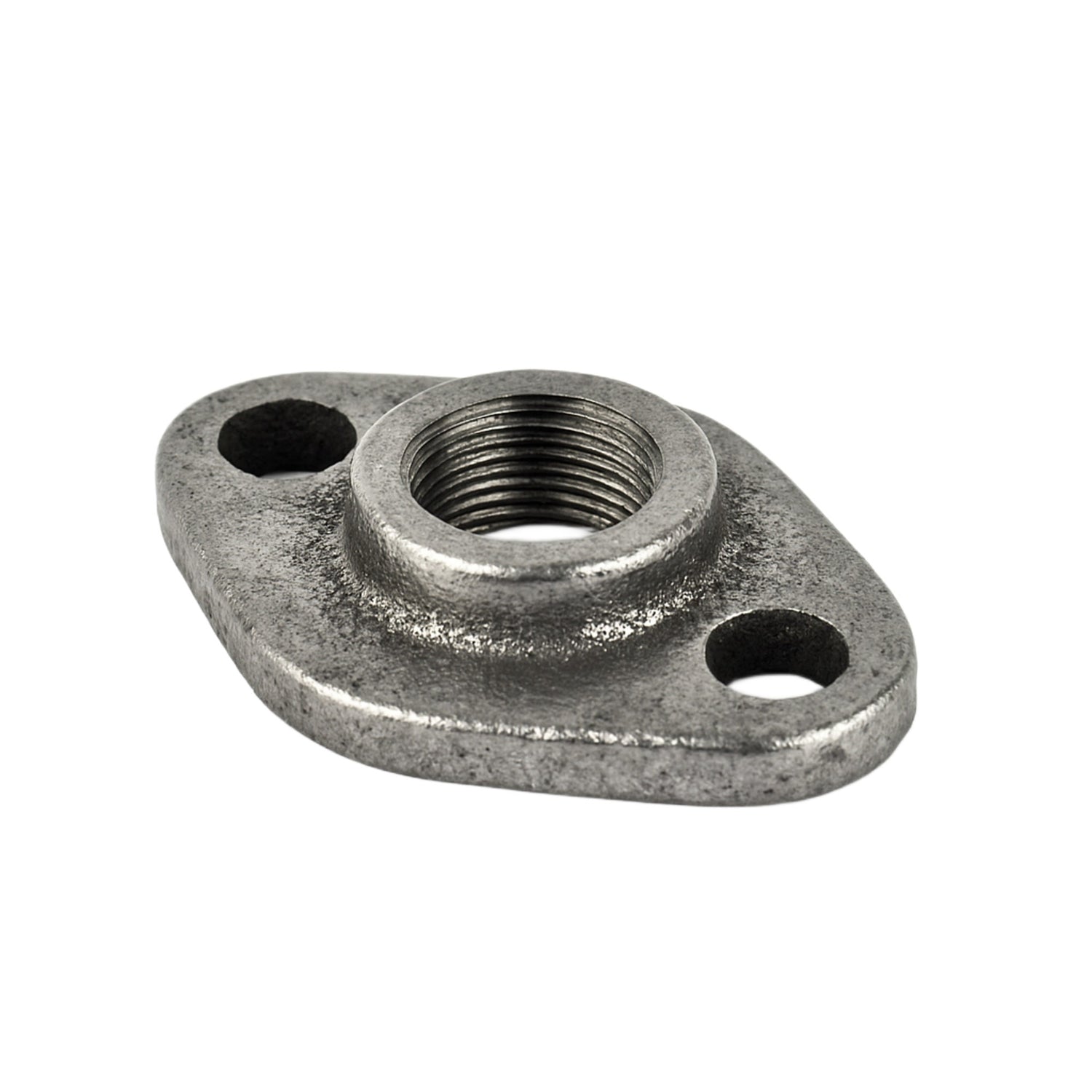 La placa ovalada de fundición negra para fijación de tubos o accesorios roscados. Esta brida de montaje es ideal para fijar tu estructura a un tabique, al techo, o simplemente colocarla en el suelo. La forma ovalada optimiza la superficie necesaria para la fijación. La instalación es fácil con tan solo 2 orificios (nota: el diámetro del orificio grande es de 12 mm).