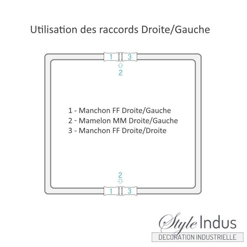 Uso interesante en decoración: en un marco o forma rectangular de tubos y racores, la última conexión es imposible con racores estándar. La combinación niple D/I + manguito D/I + manguito estándar cierra el bucle apretando ambos lados simultáneamente. Una alternativa más compacta y económica a los racores unión H/H.